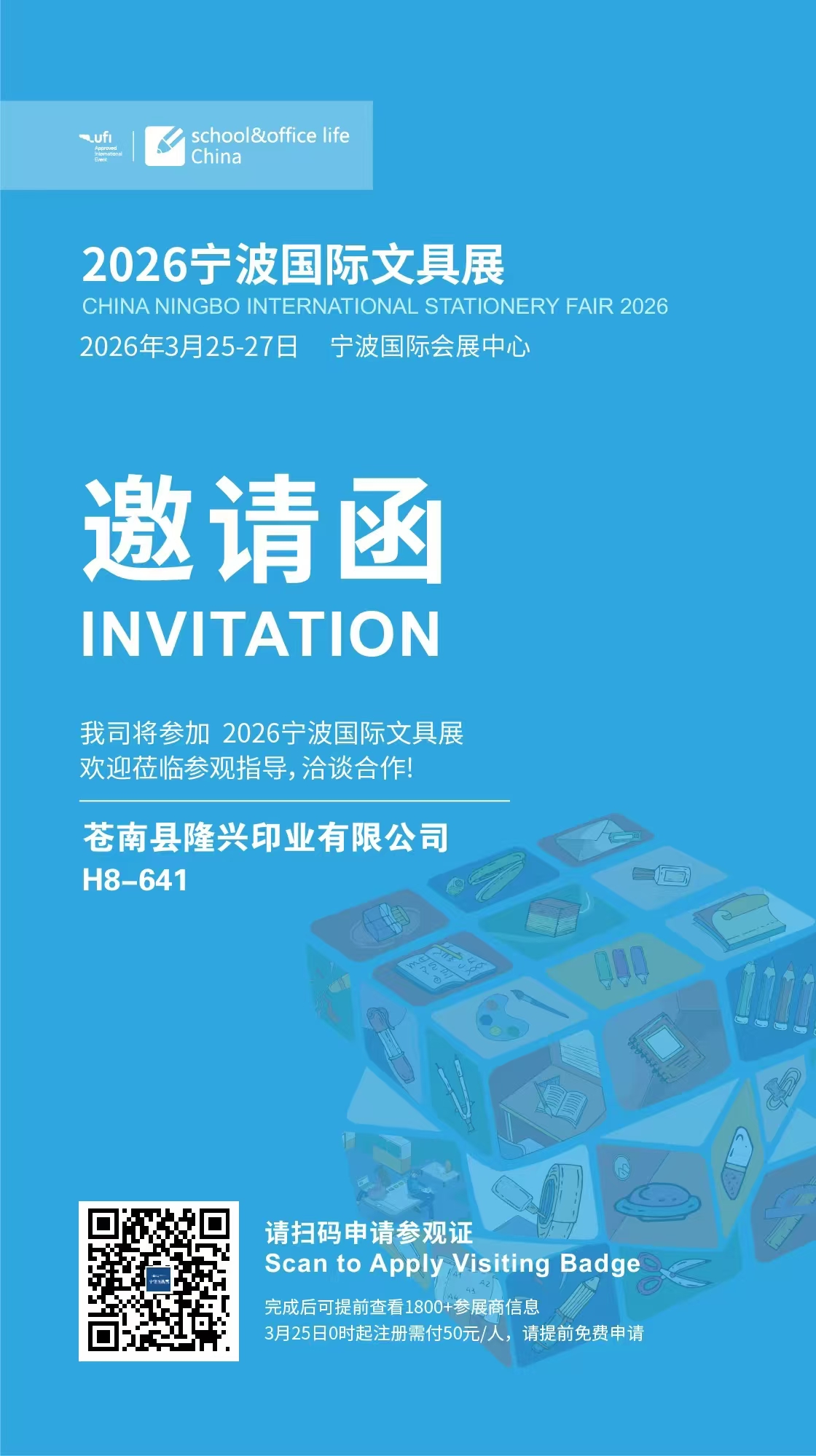 Cangnan County Longxing Printing Co., Ltd. se complace en anunciar su participación en el 2026 Feria Internacional de Papelería de China Ningbo , teniendo lugar desde 25 al 27 de marzo de 2026 , en el Centro Internacional de Exposiciones y Convenciones de Ningbo .